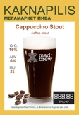 «Mad Brew» Cappuccino Stout це кавовий стаут, що пропонує насичений смак та аромат. Пиво має виразні ноти свіжозвареної кави та шоколаду, створюючи глибокий та багатий смаковий профіль. Завдяки підвищеному вмісту алкоголю, цей стаут забезпечує зігріваючий ефект, роблячи його чудовим вибором для міцних кавових напоїв.